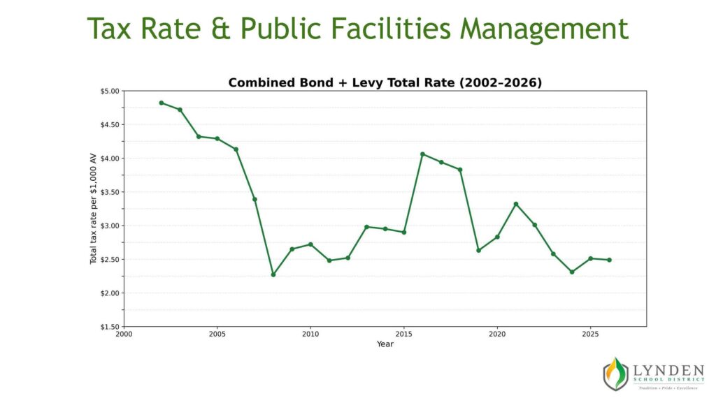 The responsibility of elected school officials is to work with the community to steward public facilities responsibly while recognizing the tax impact on residents. Over the past several years, the district completed extensive facilities planning, including four community-based planning teams. Voters were first asked to consider a comprehensive capital bond, which did not reach the required 60 percent approval threshold. After two more attempts focused only on replacing Lynden High School, the Board concluded that doing nothing was not responsible stewardship of public assets. Needs don’t go away and costs continue to increase. Lynden Schools elected officials have managed tax rates responsibly and are committed to doing so in partnership with the community’s residents. The chart below shows the tax rates for past 25 years.
